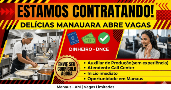 Porraifran31/03/2026🏆 Vaga de Emprego em Manaus: Delícias Manauara Contrata Auxiliar de Produção e Call Center! Quer trabalhar em Manaus? A Delícias Manauara está...