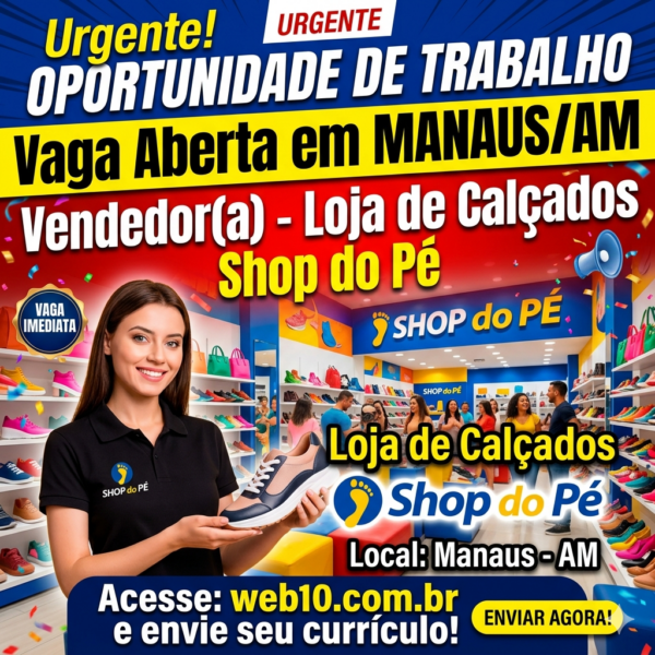 Porraifran02/04/2026Vendedor(a) – Manaus/AM | Vaga em Loja de Calçados Shop do Pé Conheça a oportunidade de emprego em vendas em Manaus A vaga...