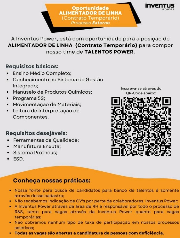 A Inventus Power, está com oportunidade para a posição de ALIMENTADOR DE LINHA (Contrato Temporário) para compor nosso time de TALENTOS POWER.