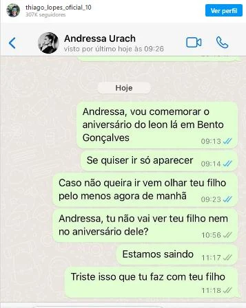 Neste último domingo, Thiago Lopes, ex de Andressa, publicou um print que pode ter sido uma conversa com a mãe do seu filho, onde ele convida para eles comemorarem o aniversário da criança. Segundo ele não teve resposta, após isso ele a acusou de abandonar o seu filho no dia do aniversário dele.