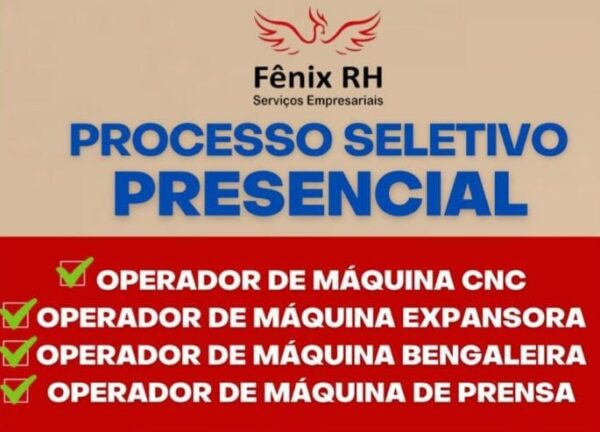 Porraifran26/04/2024Fênix RH Serviços Empresariais PROCESSO SELETIVO PRESENCIAL OPERADOR DE MÁQUINA CNC OPERADOR DE MÁQUINA EXPANSORA OPERADOR DE MÁQUINA BENGALEIRA OPERADOR DE MÁQUINA DE...