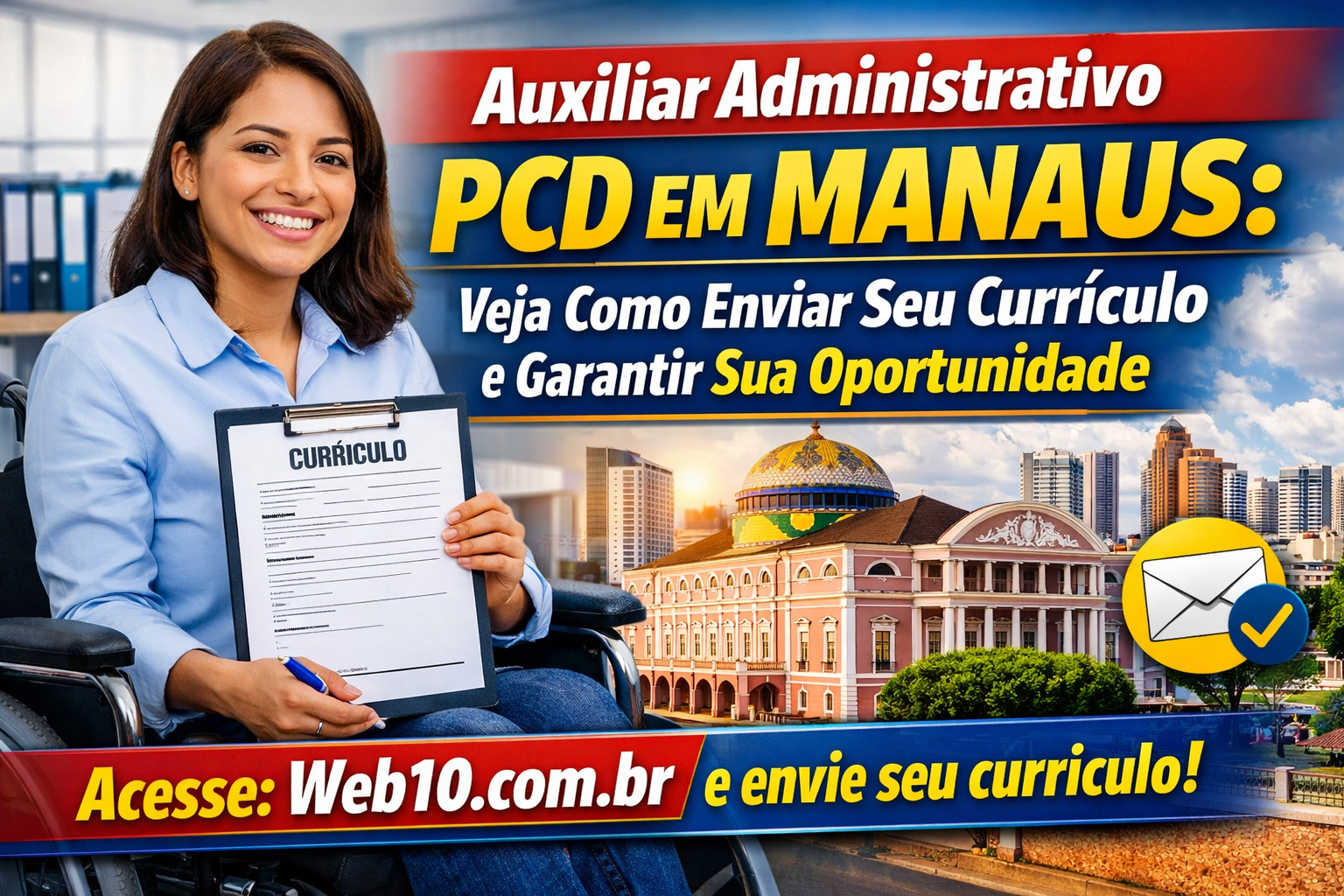 Para participar do processo seletivo da vaga de Auxiliar Administrativo PCD em Manaus, é necessário enviar o currículo atualizado por e-mail.