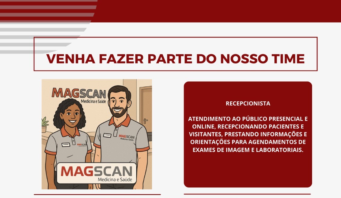 A clínica MAGSCAN Medicina e Saúde, referência em exames de imagem e atendimento médico em Manaus, está com duas oportunidades de trabalho para quem deseja ingressar ou crescer na área da saúde. As vagas são para os cargos de Recepcionista e Auxiliar de Ultrassom – Digitadora de Laudos.