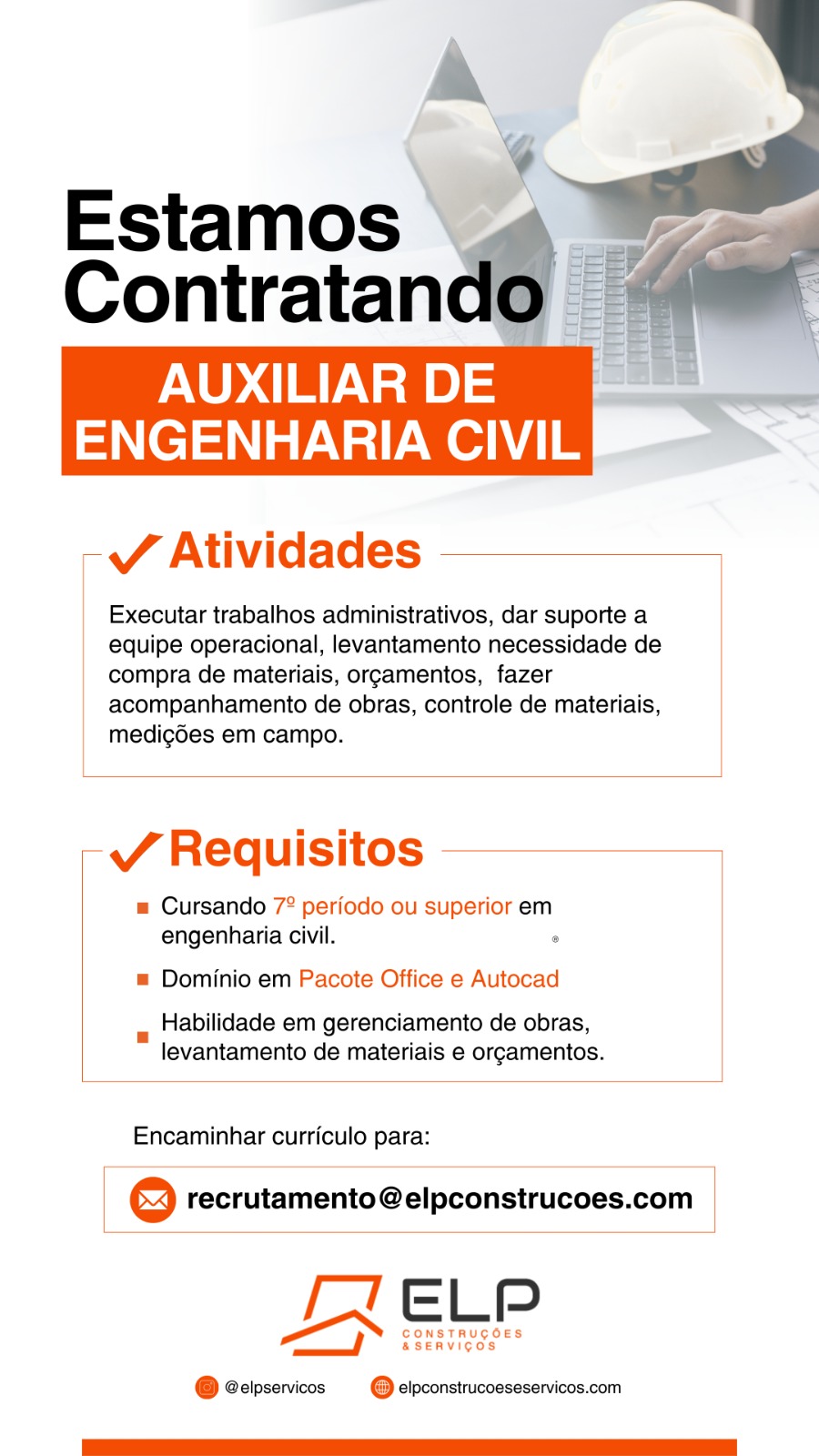 Empresa ‘ELP Construções e Serviços’ está precisando de Currículos para AUXILIAR DE ENGENHARIA CIVIL