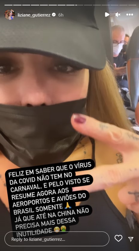 “Sem nem na China usam mais máscaras, porque nos aviões e aeroportos do Brasil temos que usar? O vírus está aglomerado só ali, né? Ainda bem que no Carnaval não tem!”, reclamou.