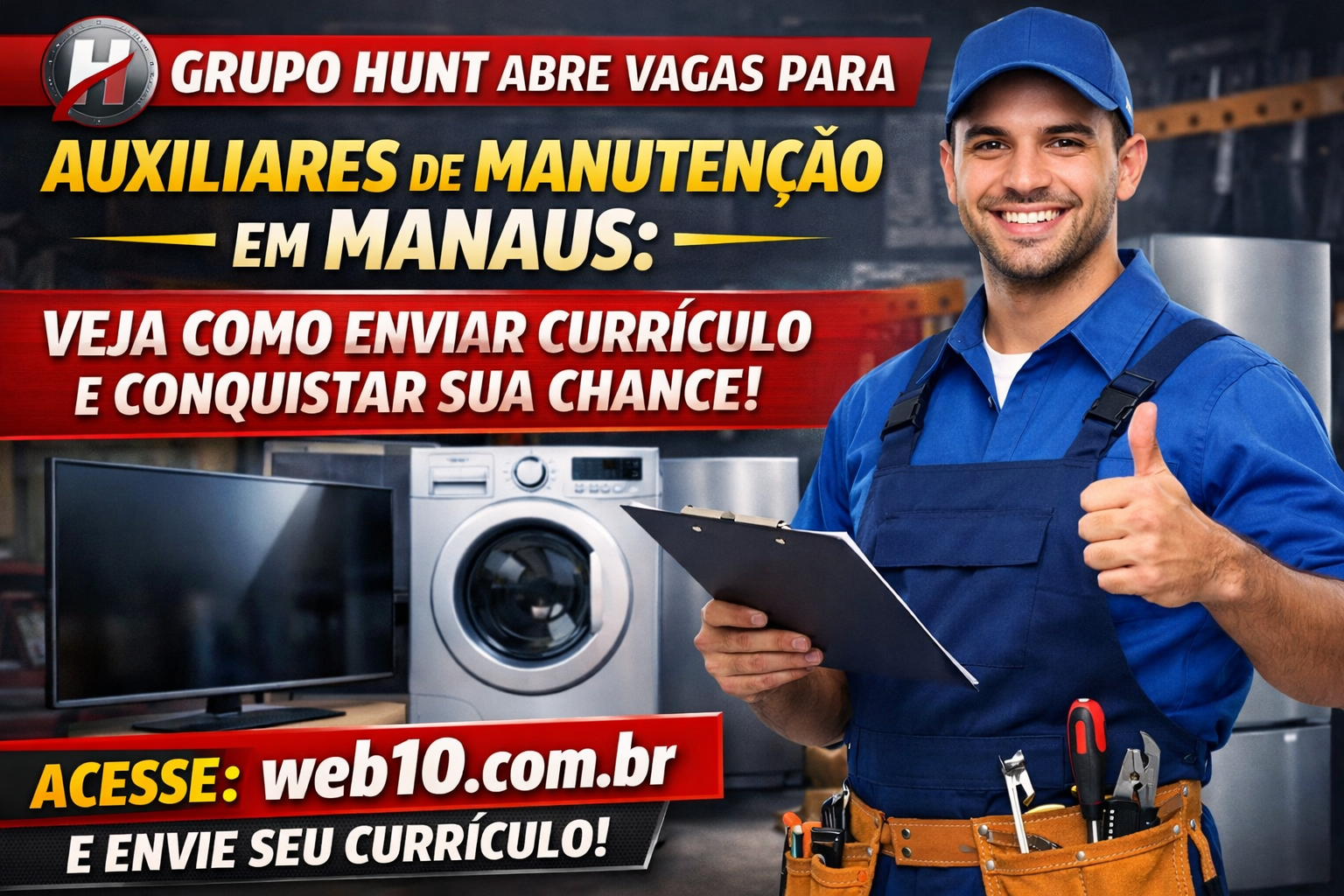 O Grupo Hunt anunciou novas vagas em Manaus para quem deseja trabalhar com manutenção de aparelhos eletrônicos e eletrodomésticos. As oportunidades são para Auxiliar Técnico de TV, Auxiliar Técnico de Linha Branca e Auxiliar Técnico de Reparo em uma empresa cliente da região.