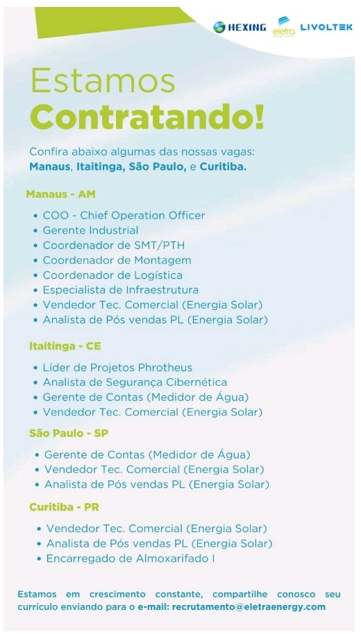 Estamos contratando!!! Venha compor nosso time em: Manaus, Itaitinga, São Paulo e Curitiba.