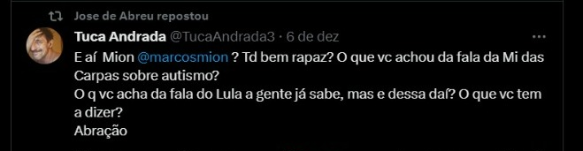 A repercussão do caso nas redes sociais atraiu a atenção de outros artistas, como o ator Tuca Andrada, que provocou Mion com um tweet: “E aí, Mion @marcosmion? Tudo bem, rapaz? O que você achou da fala da Mi das Carpas sobre autismo? O que você tem a dizer? Abração”, questionou Andrada. O ator veterano José de Abreu, colega de emissora de Mion, também se envolveu na discussão ao compartilhar o tweet provocativo em seu perfil no Twitter.