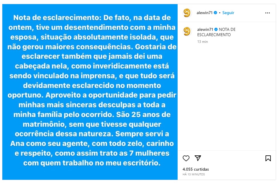 Alexandre Correa, marido da apresentadora Ana Hickmann, utilizou suas redes sociais para se pronunciar sobre as recentes acusações de violência doméstica feitas contra ele. O empresário, casado com Ana há 25 anos e pai de um filho de 9 anos, admitiu ter havido um desentendimento, mas negou veementemente ter cometido agressões físicas.
