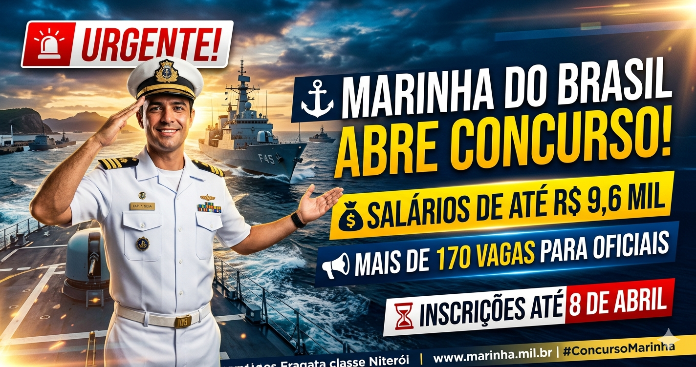 Concurso da Marinha do Brasil oferece mais de 170 vagas para Oficiais com salários de até R$ 9,6 mil. Veja como se inscrever, etapas e dicas para passar.