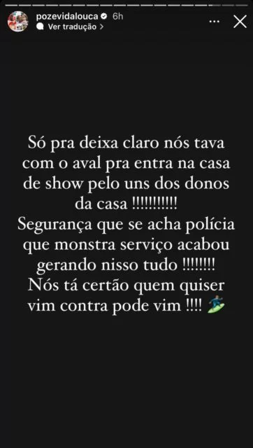 Após o ocorrido, o funkeiro e seus amigos se afastaram da entrada da boate. Nas redes sociais, MC Poze do Rodo se pronunciou sobre o incidente. Em uma publicação, ele afirmou que tinha autorização para entrar na casa de show por um dos donos, mas que os seguranças exageraram na abordagem. “Segurança que se acha polícia, quer mostrar serviço, acabou gerando tudo isso. Nós estamos certos e quem quiser vir contra nós pode vir”, escreveu.
