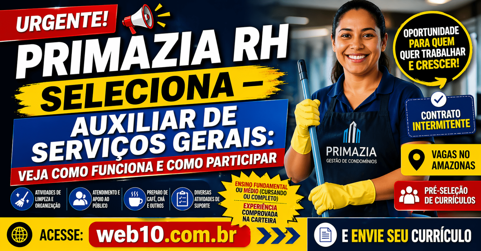 A busca por uma oportunidade de trabalho pode ser desafiadora, porém surgem vagas que facilitam a entrada no mercado. A Primazia RH seleciona Auxiliar de Serviços Gerais, oferecendo uma chance para quem deseja trabalhar e conquistar renda, mesmo com pouca experiência ou escolaridade básica.
