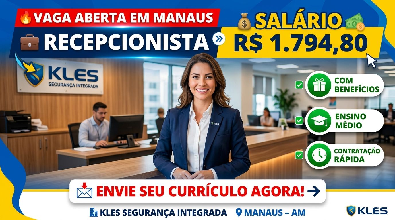 A empresa Kles Segurança Integrada está com uma excelente oportunidade de emprego em Manaus para o cargo de recepcionista. Essa vaga é ideal para quem já tem alguma experiência na área e deseja trabalhar em horário comercial, com benefícios garantidos.