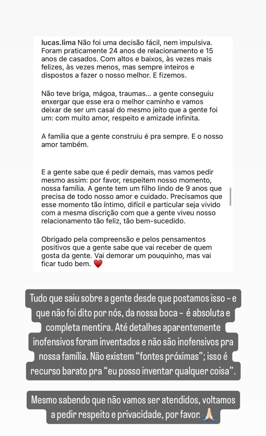 Mesmo cientes de que seu pedido possivelmente não será atendido, Sandy e Lucas reforçaram o apelo por respeito e privacidade nesse momento delicado. O músico também compartilhou a publicação em seu perfil no Instagram.