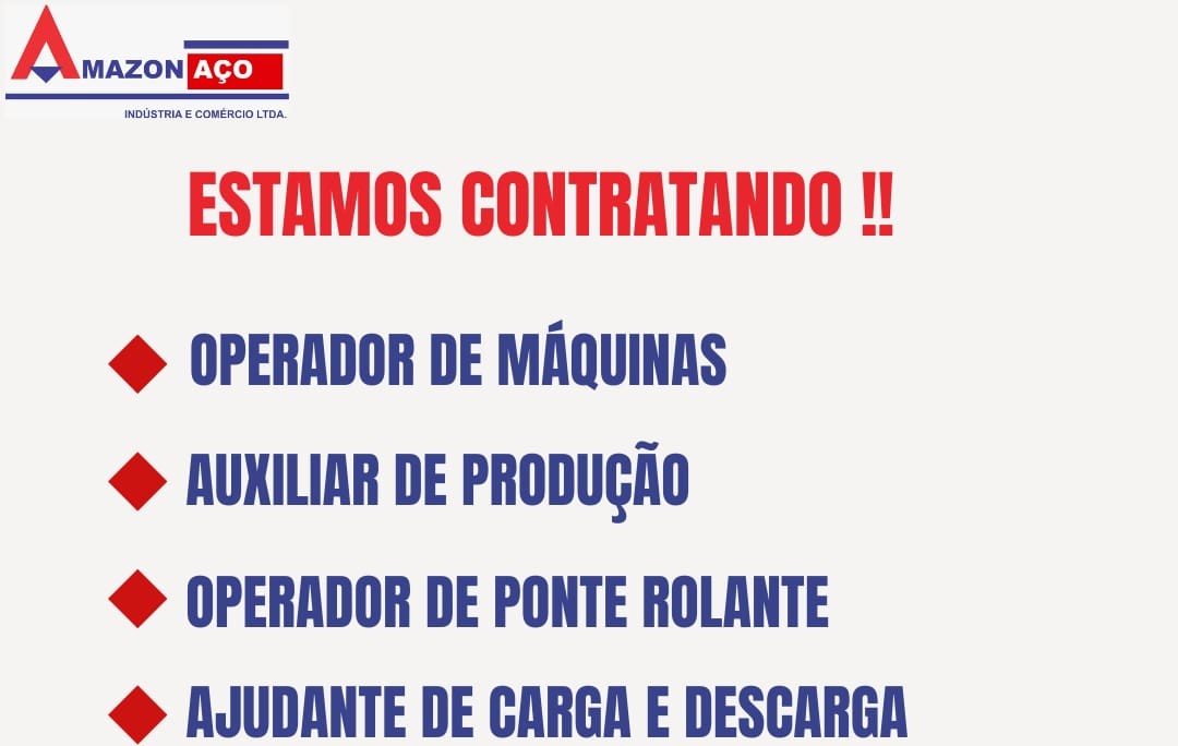 A Amazon Aço está contratando para diferentes funções, todas ligadas ao funcionamento da indústria. Dessa forma, é possível encontrar uma vaga que combine melhor com o perfil e a experiência de cada pessoa.