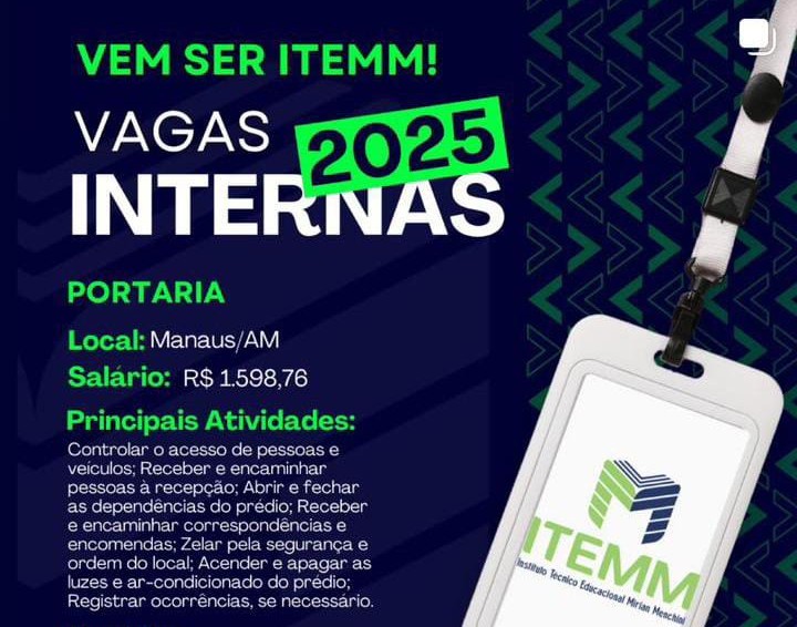 O Instituto Técnico Educacional Mirian Menchin (ITEMM) está com vagas abertas para a área de Portaria em Manaus/AM. Essa pode ser uma excelente chance para quem procura um emprego fixo, com salário de R$ 1.598,76 e benefícios que fazem a diferença no dia a dia.