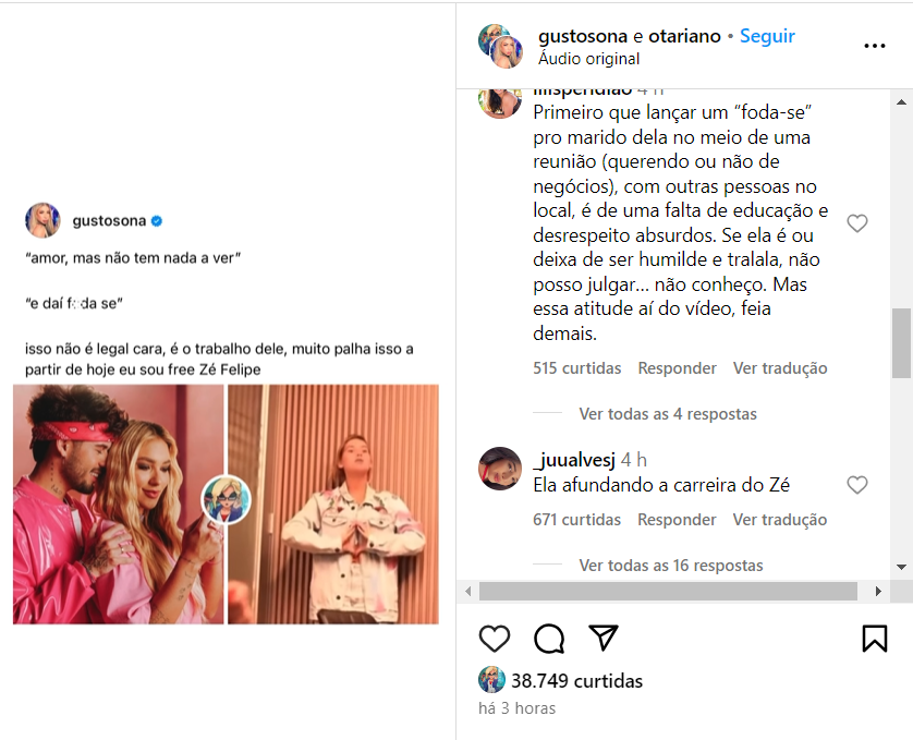Além disso, as músicas de Zé Felipe também foram alvo de críticas. Uma internauta disse: “Essa dança ficou ridícula e as músicas também estão péssimas”. Outra pessoa criticou sem papas na língua: “Não sei o que é pior: chamar isso de dança ou o que ele canta de música”.
